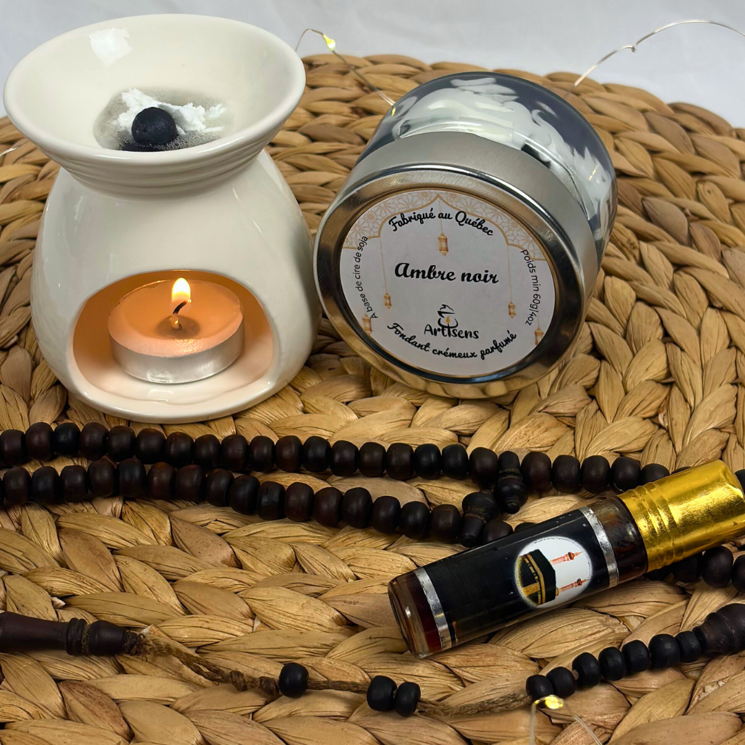 Si vous appréciez les parfums orientaux et originaux, vous êtes au bon endroit. L’Ambre Noir rend hommage à mes origines tunisiennes. Symbole de délicatesse et de noblesse, il se distingue par une fabrication exigeante, nécessitant des ingrédients précieux et un savoir-faire minutieux. Son élaboration, longue et soignée, donne naissance à un parfum unique, mêlant harmonieusement les notes d’encens, de résine et de musc.